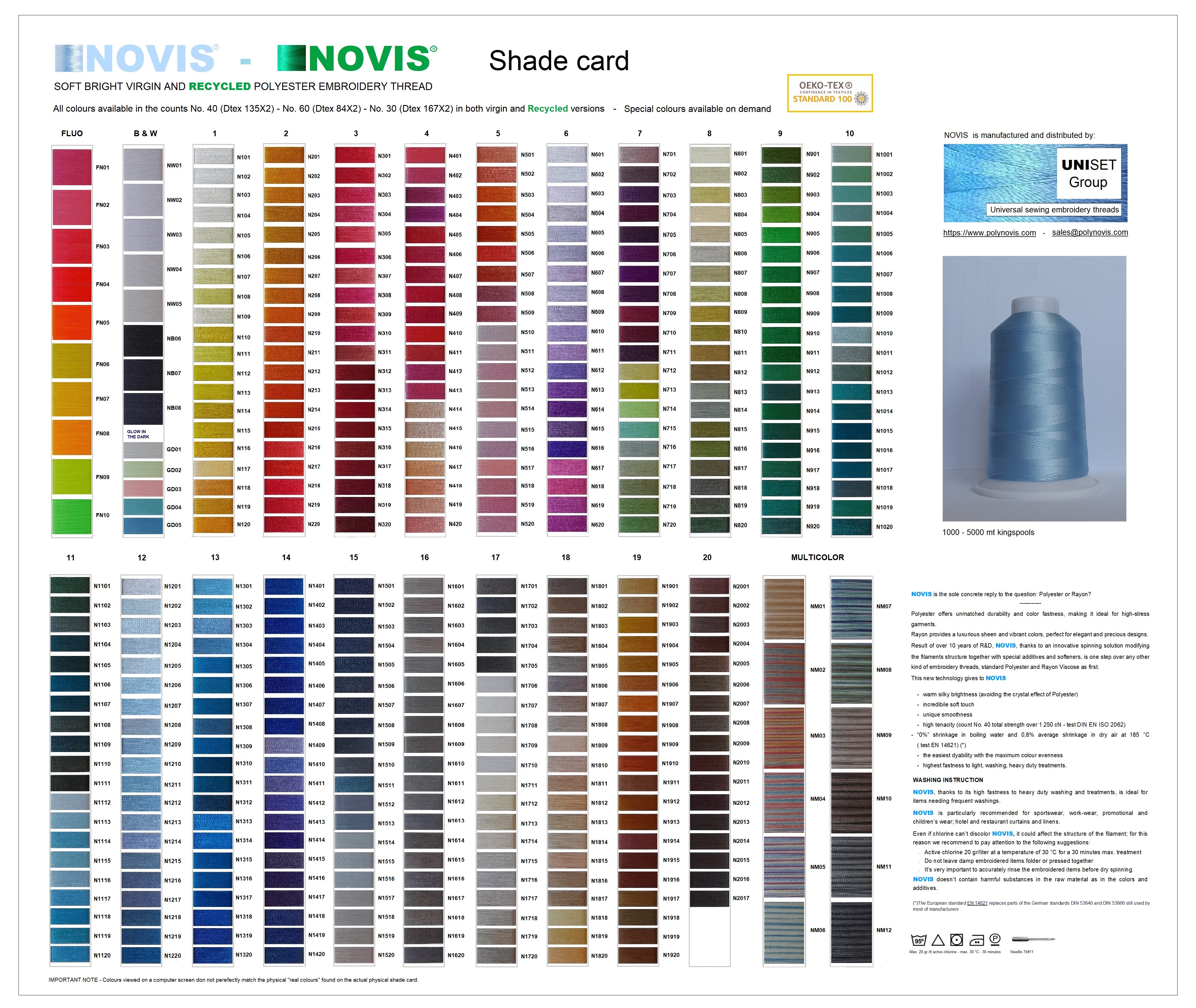 Result of over 10 years of R&D, NOVIS, thanks to an innovative spinning solution modifying the filaments structure together with special additives and softeners, is one step over any other kind of embroidery threads, standard Polyester and Rayon Viscose as first.